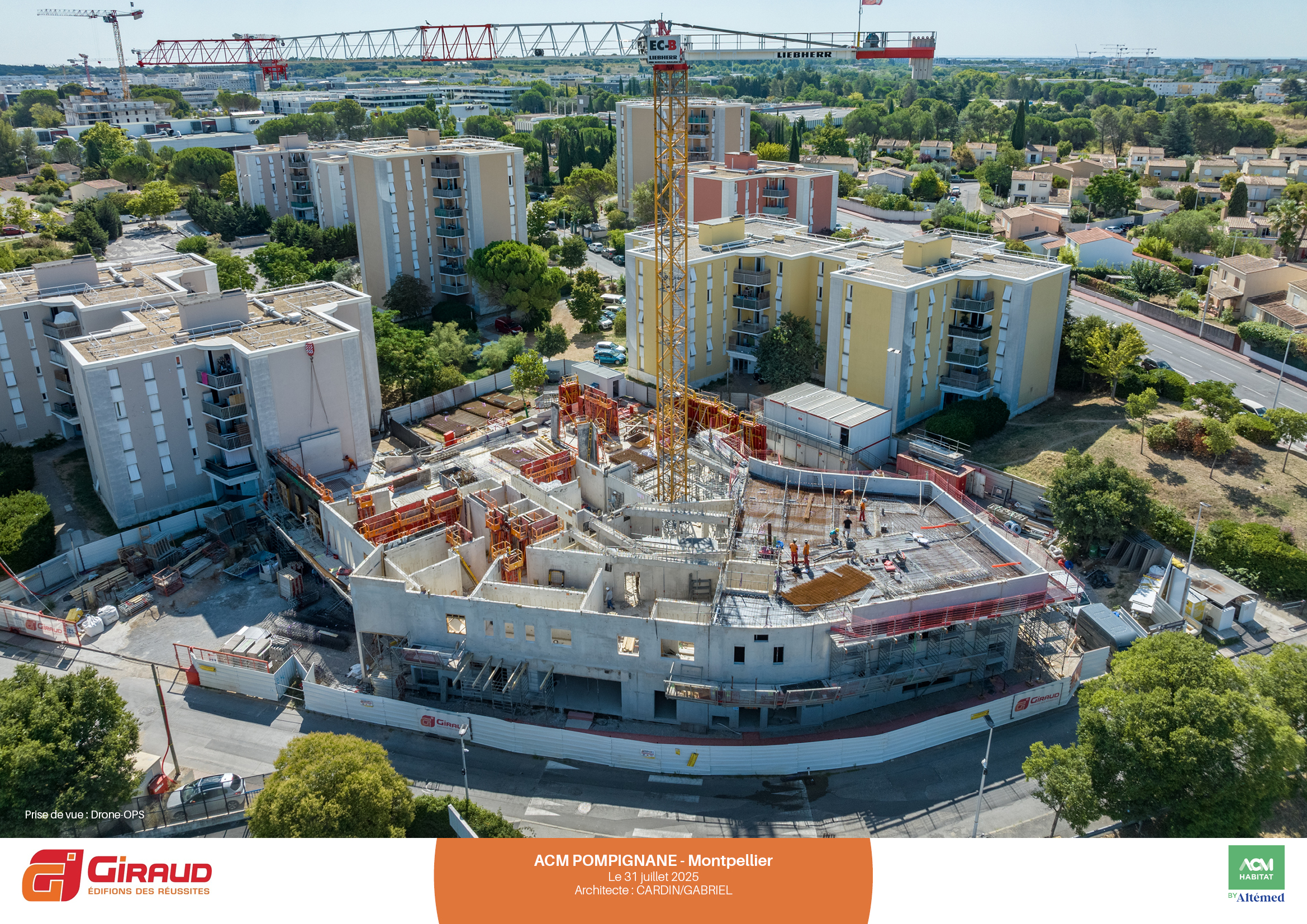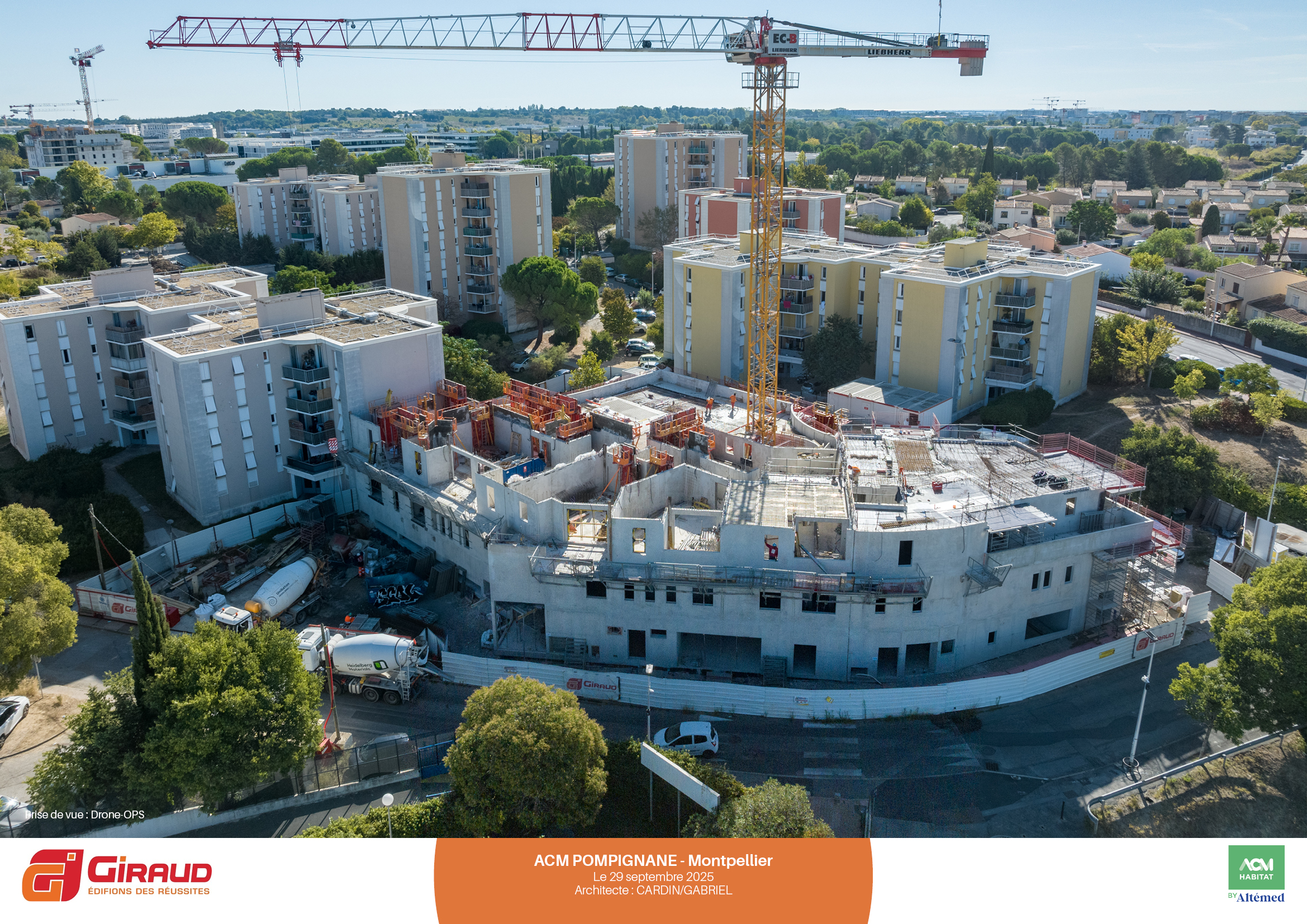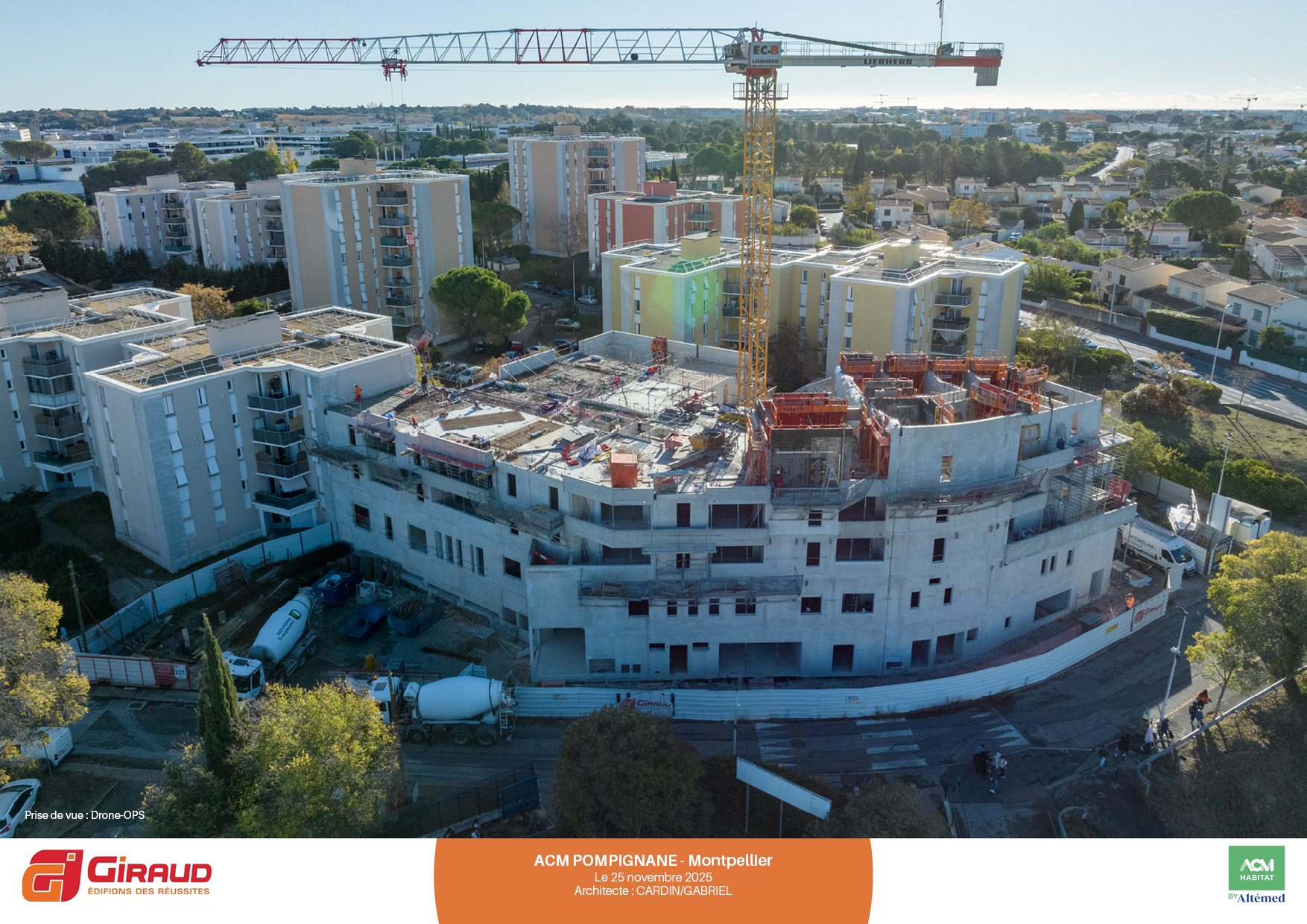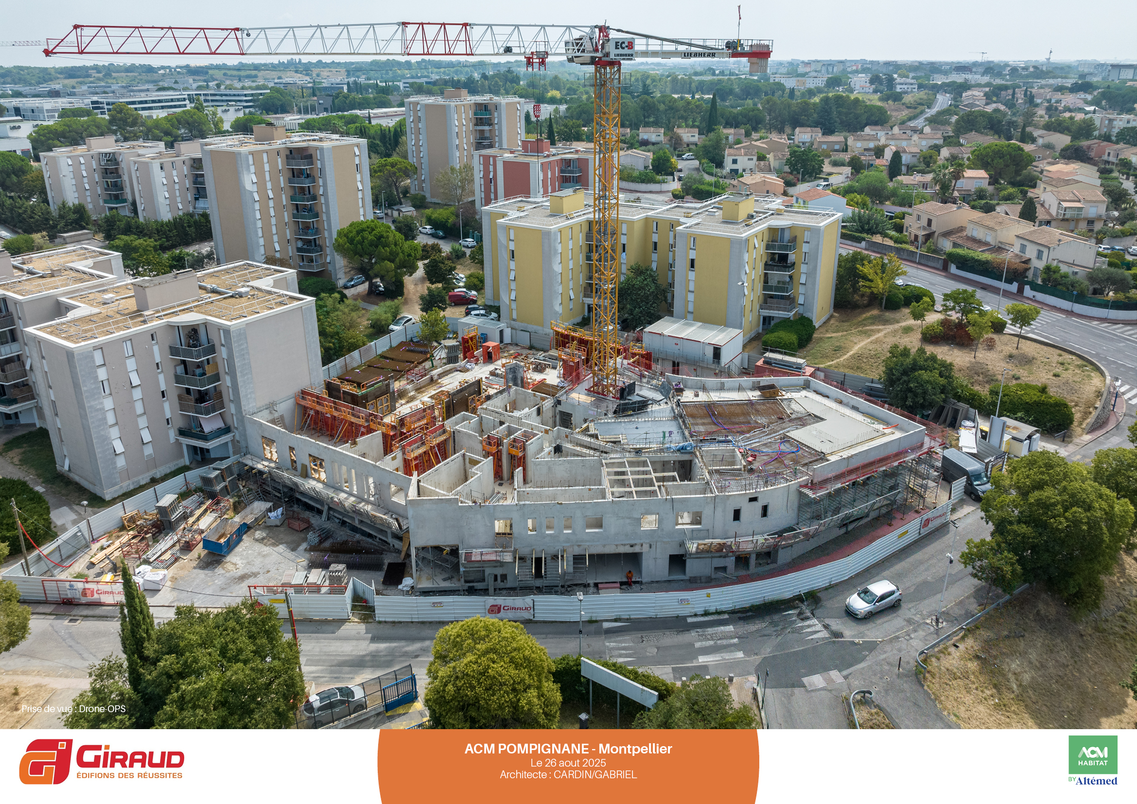 Située dans le quartier la Pompignane, cette résidence Séniors est constituée de 58 logements (répartis dans 2 bâtiments en R+5 et R+6) et d'une Crèche de 48 berceaux (en RDC Haut), avec 3 niveaux de parkings (en R-2, R-1 et semi-enterré en RDC).