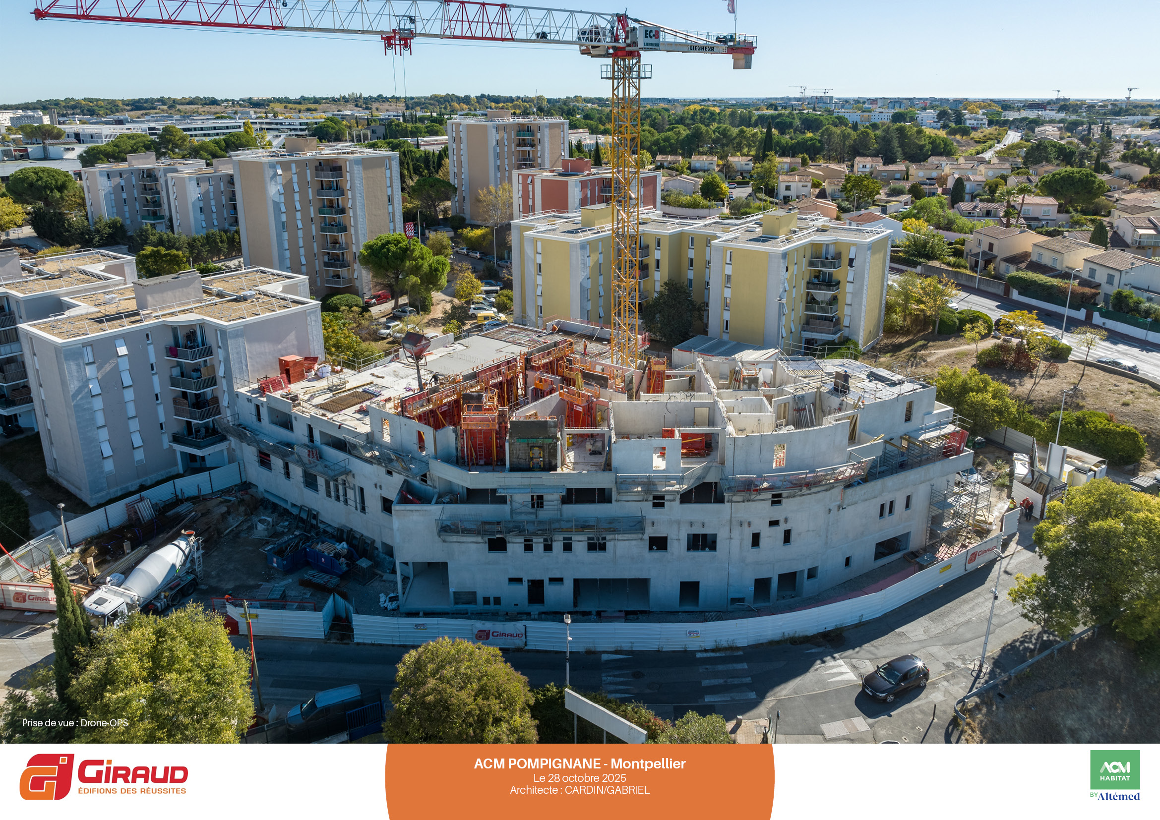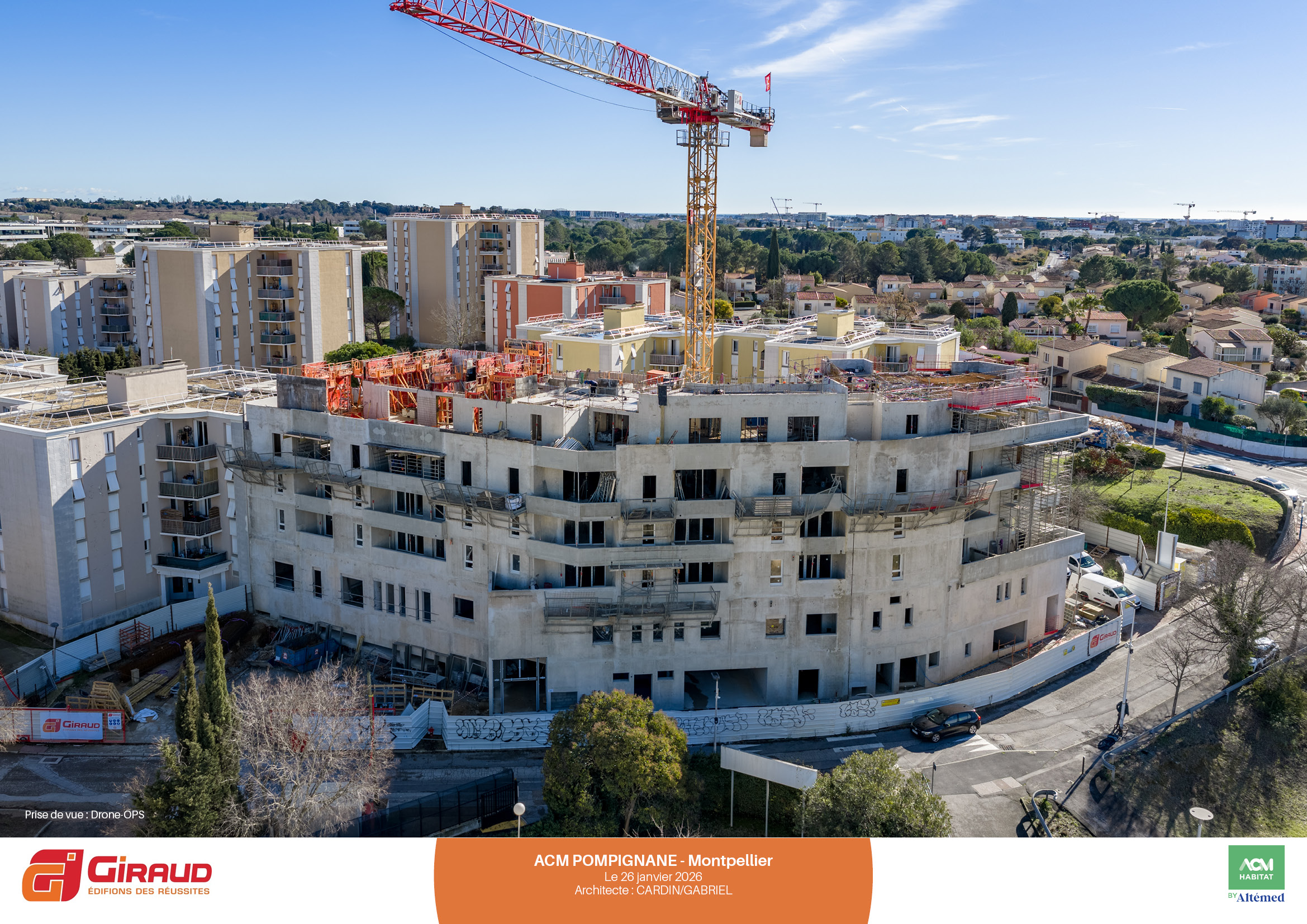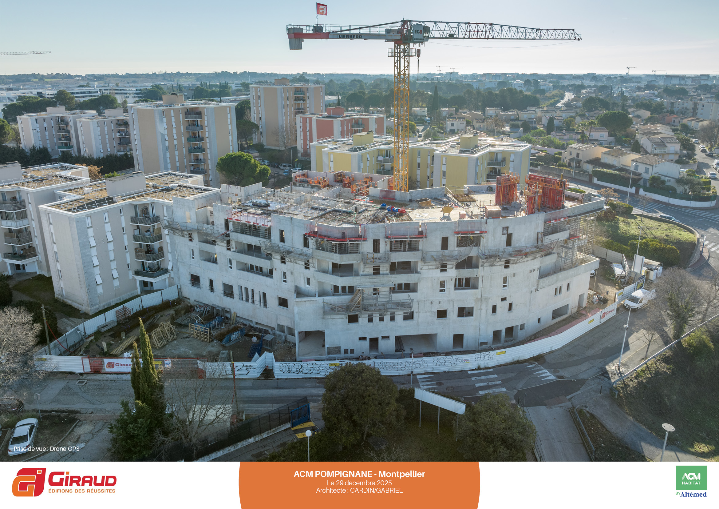Située dans le quartier la Pompignane, cette résidence Séniors est constituée de 58 logements (répartis dans 2 bâtiments en R+5 et R+6) et d'une Crèche de 48 berceaux (en RDC Haut), avec 3 niveaux de parkings (en R-2, R-1 et semi-enterré en RDC).
