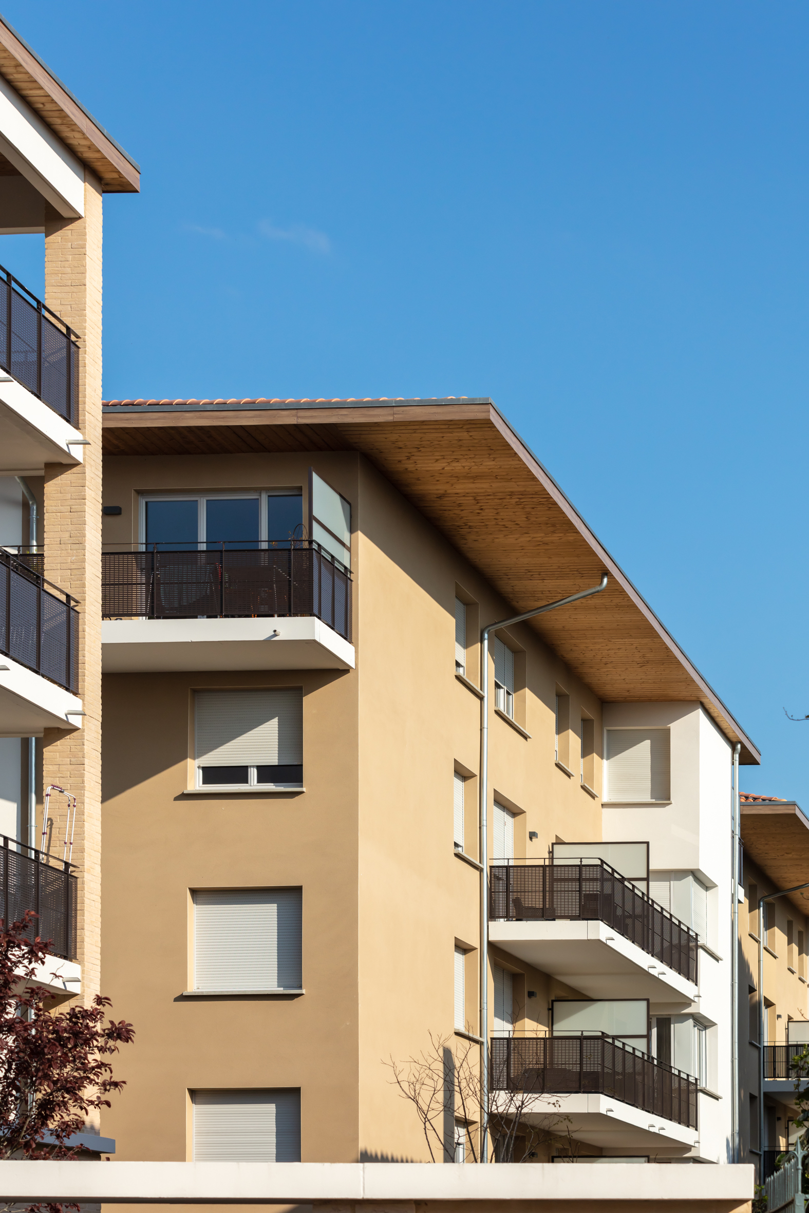 Sur ce socle de verdure, les immeubles séduisent par la douceur de leurs lignes claires, habillées de plaquettes ton pierre et surmontées de toitures en tuile double canal rose, emblématiques de Toulouse.