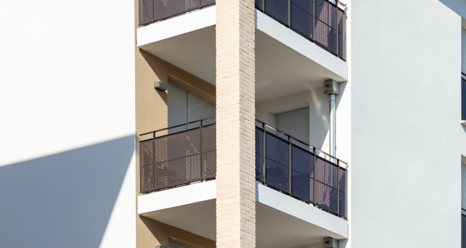 Discrètes notes contemporaines, les garde-corps des balcons et terrasses se parent d’une délicate résille de métal.